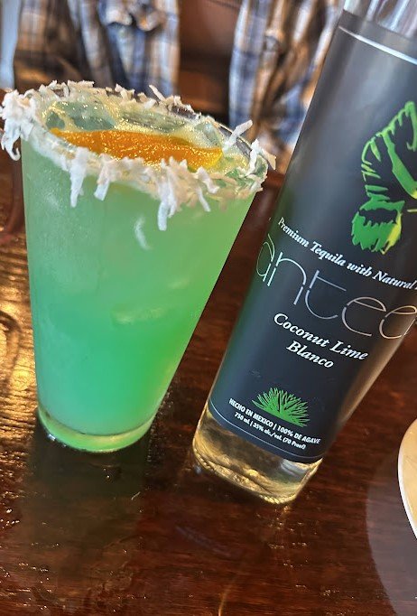 Anteel Coconut-Lime Tequila w/ our house-made margarita mix w/ Orange & Pineapple Juice, with a Coconut Rim